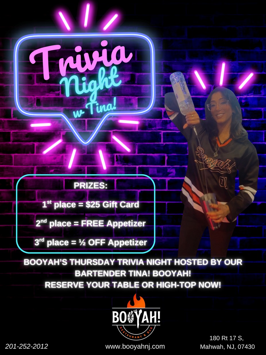 Trivia Night with the One and Only...Tina! Come bring some friends & have some fun! Answer questions, eat, drink, and Win some Prizes! BOOYAH!
