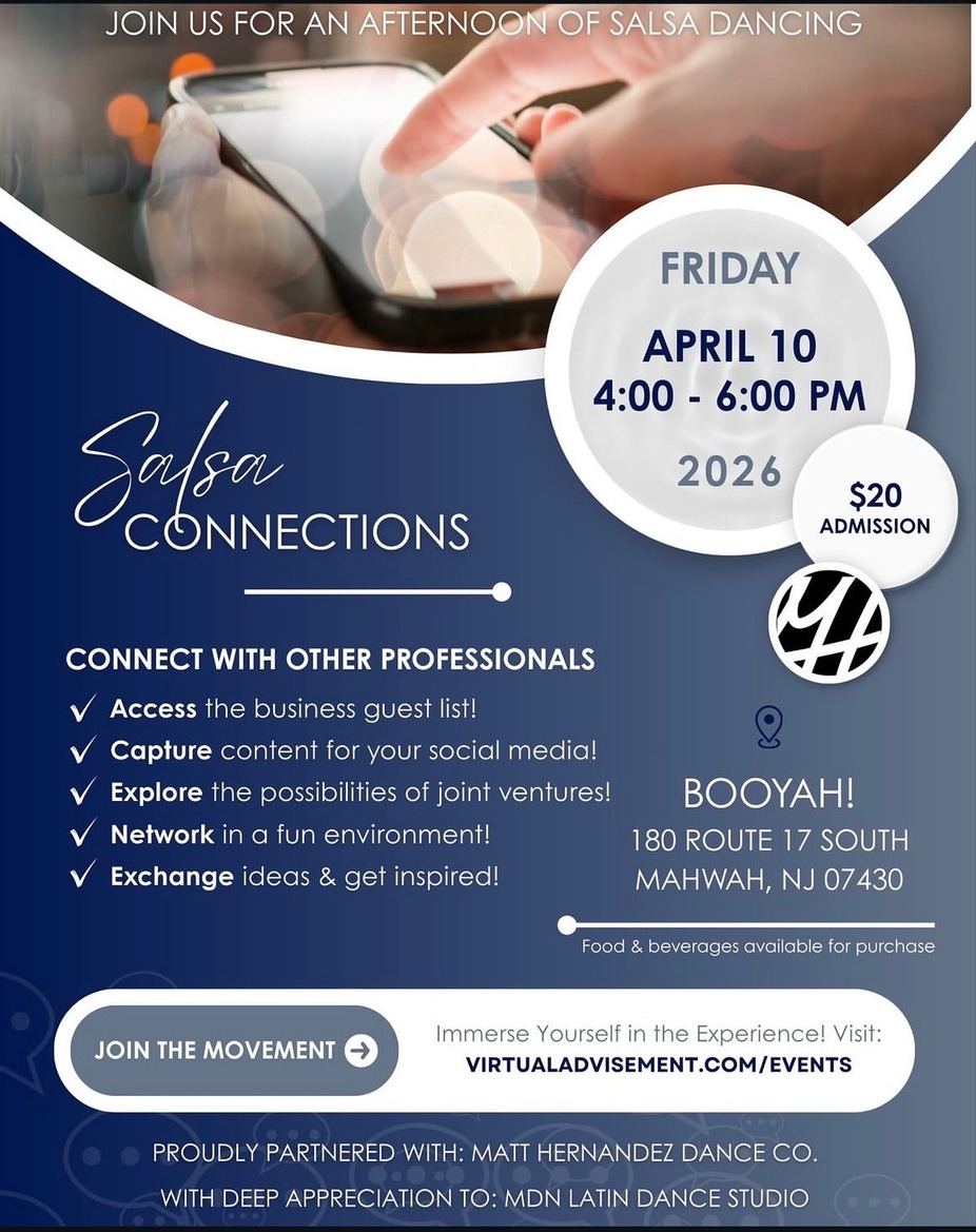 Salsa Connections is a networking event designed to bring professionals together in a relaxed and energetic environment. Instead of the typical business gathering, this event blends professional connections with the fun and rhythm of salsa dancing. The event is hosted in partnership with Matt Hernandez Dance Co. and will take place at BOOYAH! in Mahwah, NJ. Food and beverages will be available for purchase during the event.