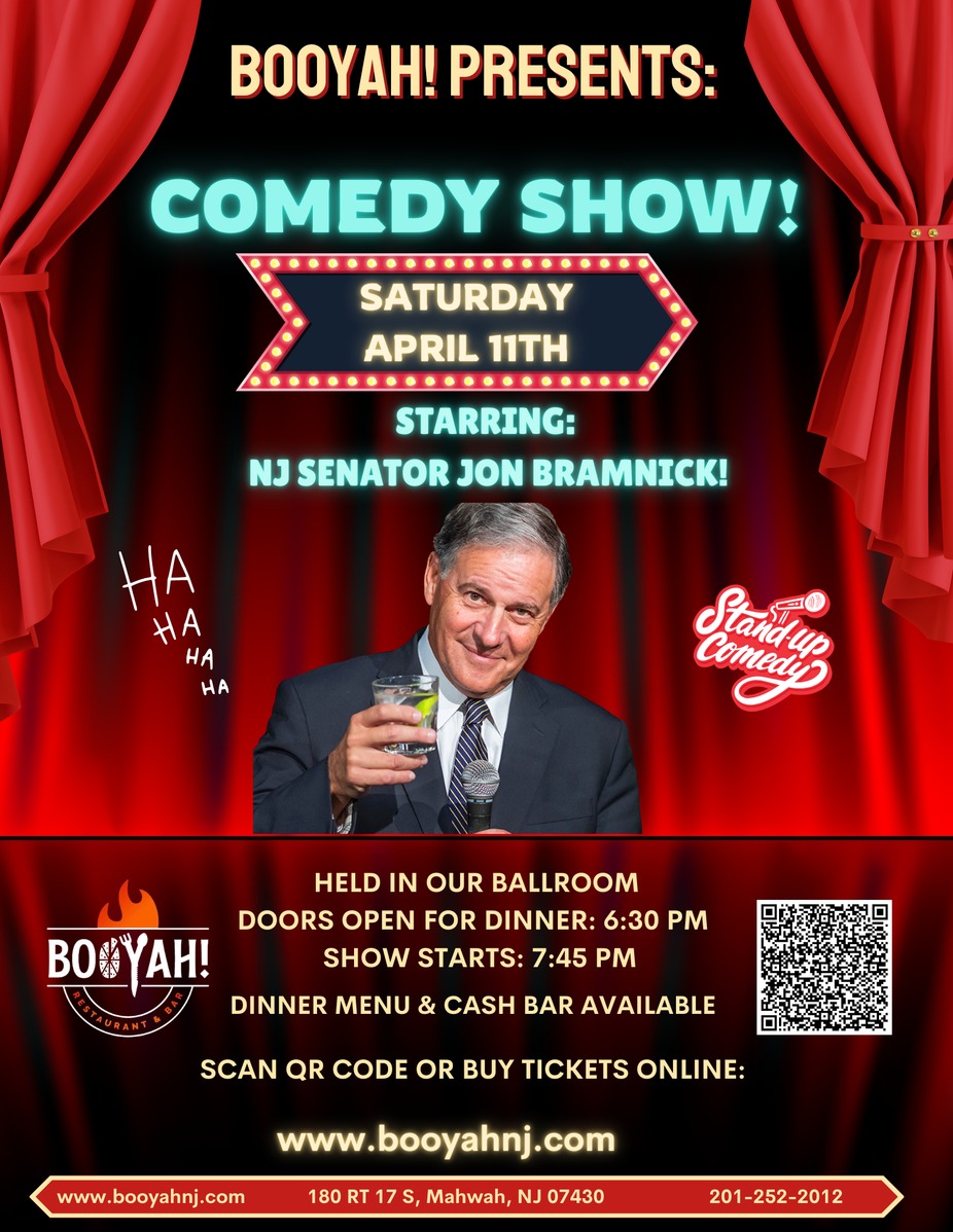 Get ready for a night of laughs with New Jersey's FUNNIEST SENATOR & LAWYER, Jon Bramnick! Come enjoy some top-notch comedy & delicious food from BOOYAH! Held in our BALLROOM, don't miss out on the fun! A DINNER MENU will be provided & a CASH BAR will be available inside!
